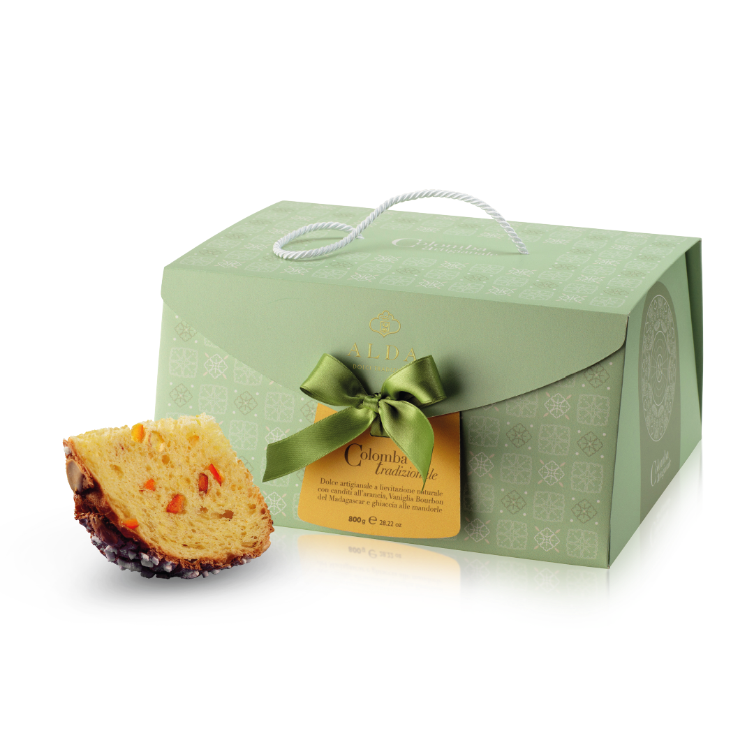 La colomba pasquale artigianale ALDA nella sua forma più essenziale. Lievitazione naturale, scorze d’arancia candite e una glassa alle mandorle che completa senza appesantire. Qui nulla è aggiunto per stupire: tutto è calibrato per restituire un gusto pulito, riconoscibile, fedele alla tradizione. Una colomba che non cerca reinterpretazioni, ma precisione.